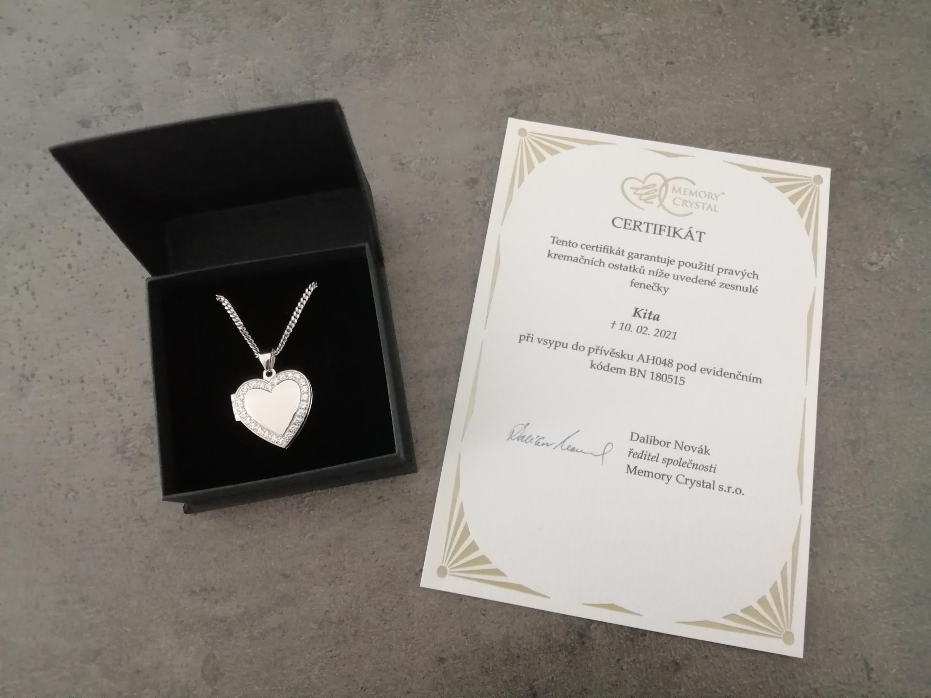 Medailonek je vyroben z kvalitního stříbra 925 s vnitřní dutinkou, do které lze vsypat malé množství popela zesnulého zvířátka. Tento vnitřní prostor je uzavřen na zadní straně šroubením rovněž ze stříbra. Popel je do medailonku vsypán pod odborným dohledem našeho dodavatele. O jeho pravosti svědčí i certifikát, který je dodán zpět i s medailonkem. Srdíčko je dále ozdobeno krásnými broušenými kamínky.